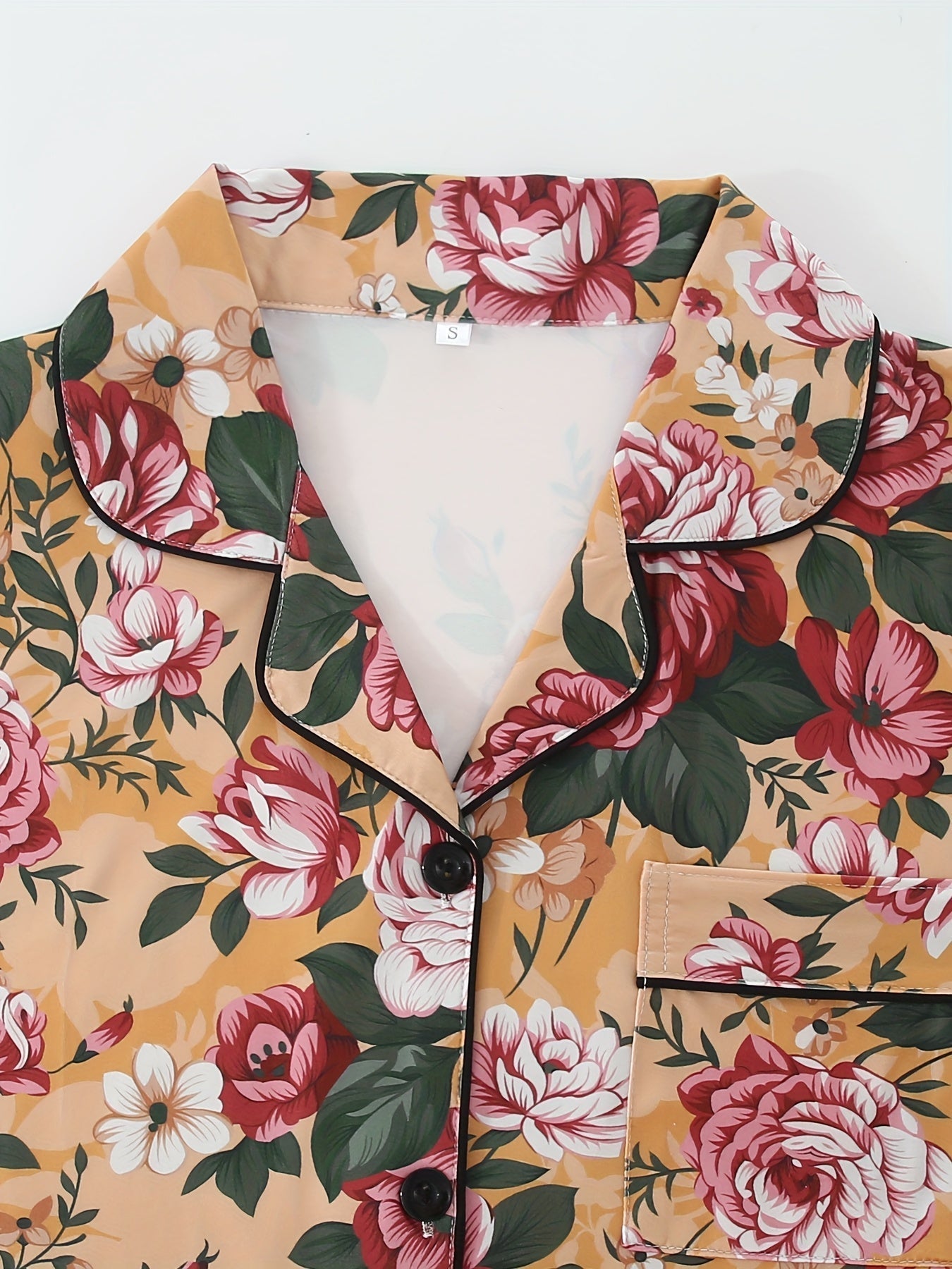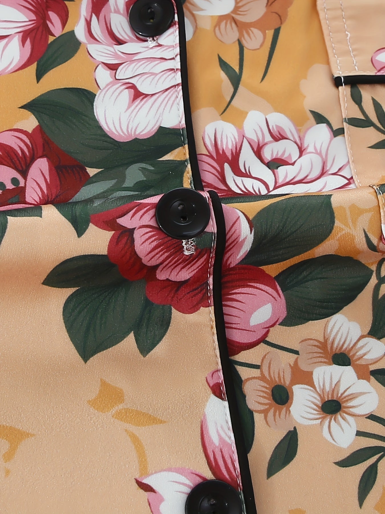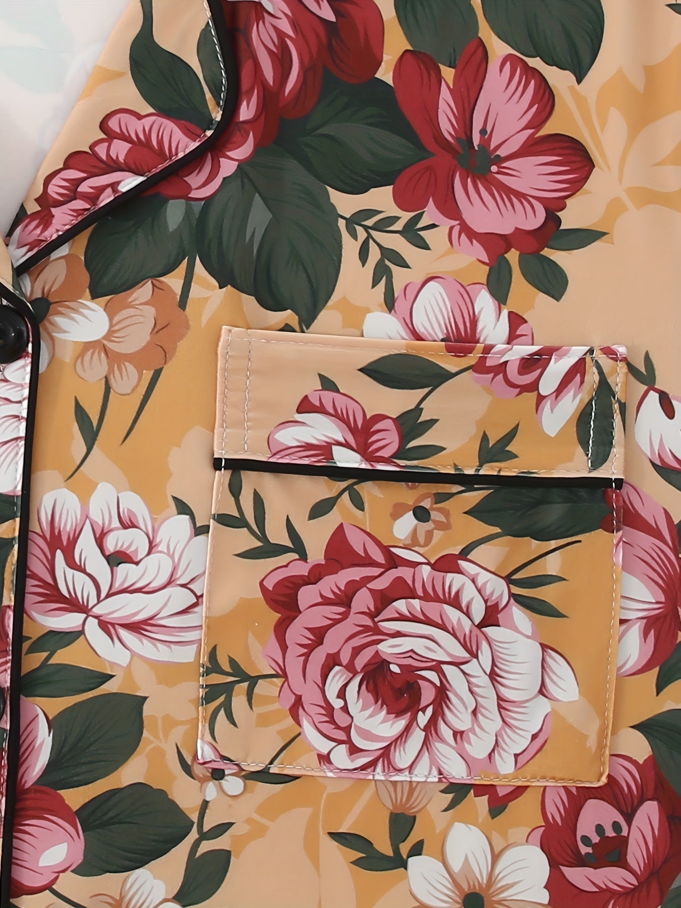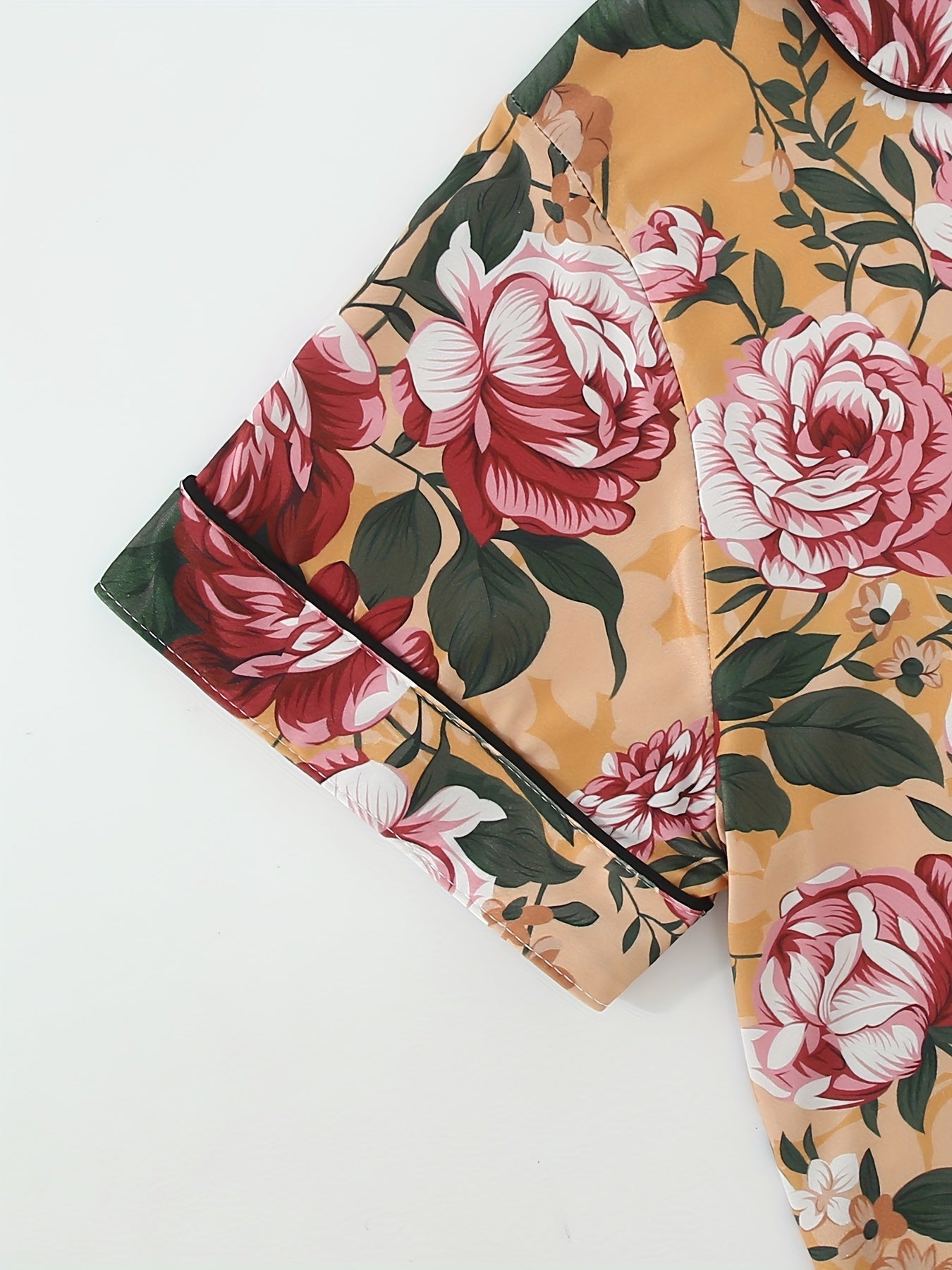 Bring floral elegance to your bedtime with this rose-print 3-piece nightwear set, featuring a short-sleeve button-down shirt, elastic waist shorts, and full-length pajama pants. The warm mustard base is beautifully adorned with bold red and pink roses with green leaves, creating a timeless and graceful look for your loungewear.
