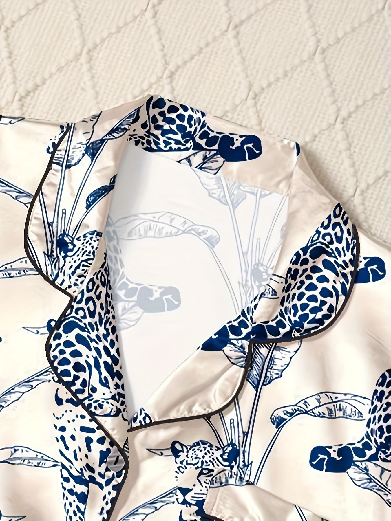 Add a touch of wild sophistication to your nights with this leopard-print 3-piece nightwear set, featuring a short-sleeve button-down shirt, elastic waist shorts, and full-length pajama pants. Designed on a soft beige base with detailed navy blue leopard and tropical leaf prints, this set brings both elegance and comfort to your loungewear.