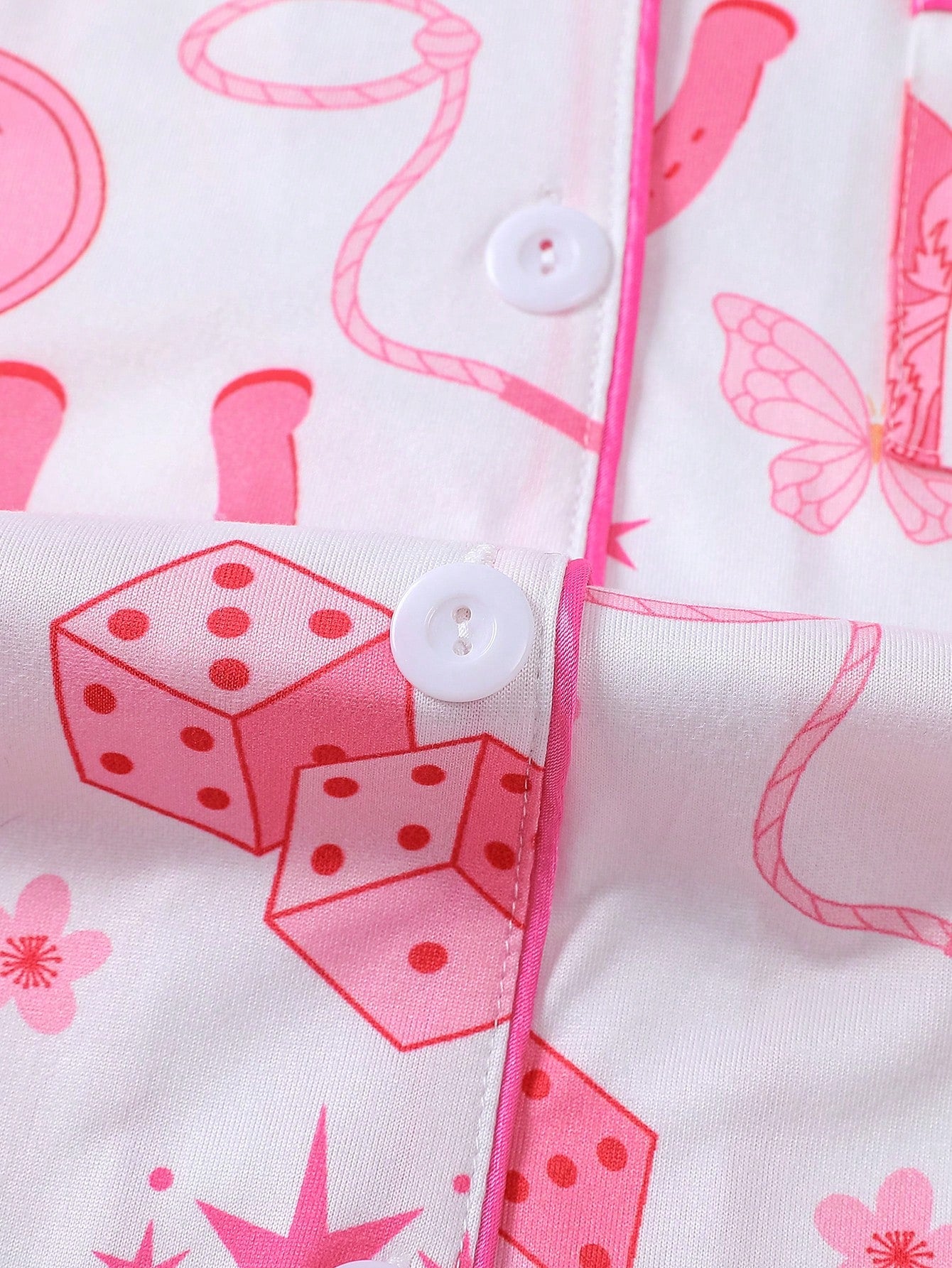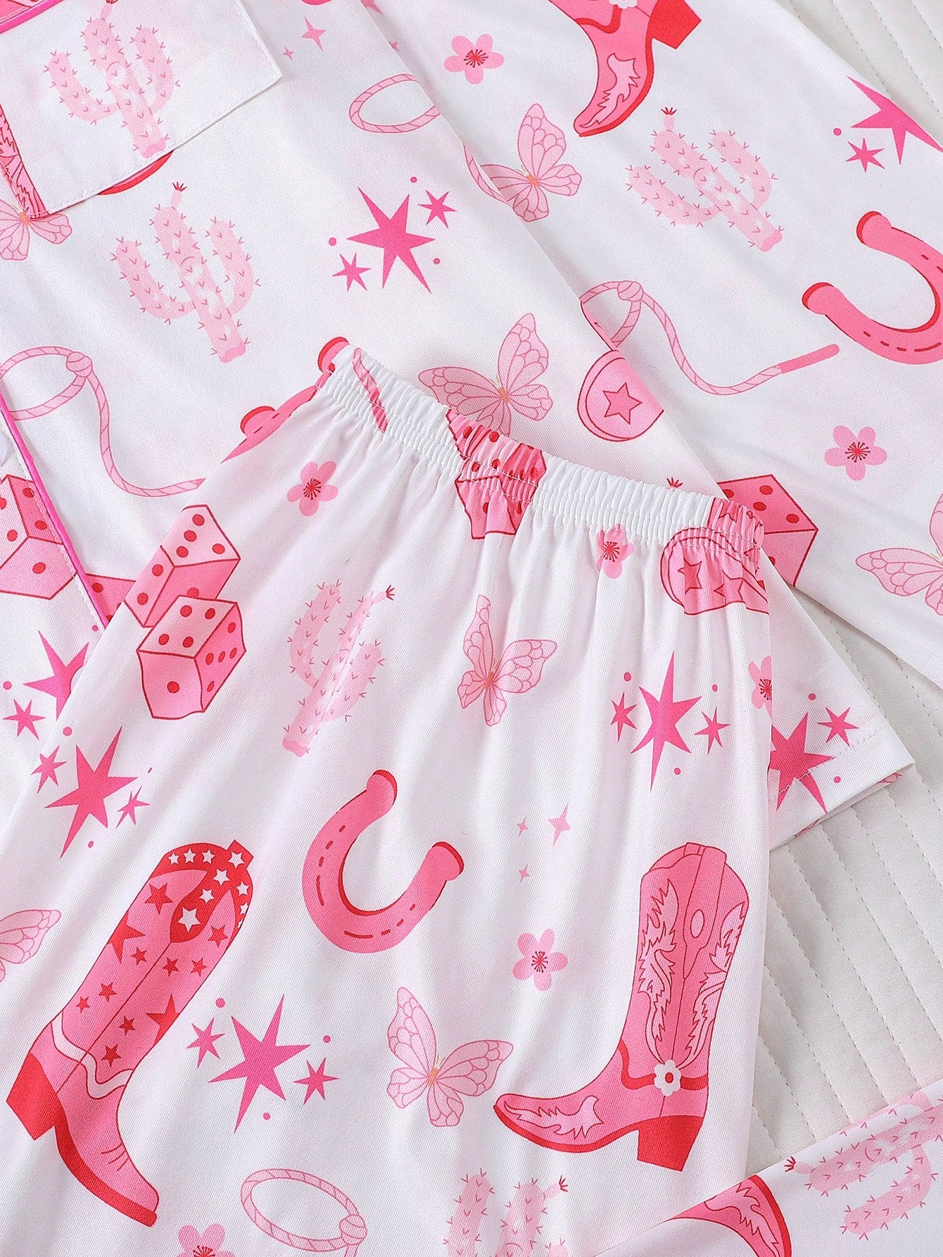 The Lucky Cowgirl Printed Pajama Set blends playful western-inspired charm with everyday comfort. Made from soft, breathable fabric, this two-piece set features a crisp white base adorned with pink western motifs, including cowboy boots, horseshoes, dice, stars, and butterflies. The long-sleeve button-front top is finished with contrast pink piping and a classic collar for a refined sleepwear silhouette. Coordinated straight-leg pants provide a relaxed fit that moves comfortably from bedtime to lounging. Ideal for customers seeking novelty sleepwear with a feminine, modern twist.