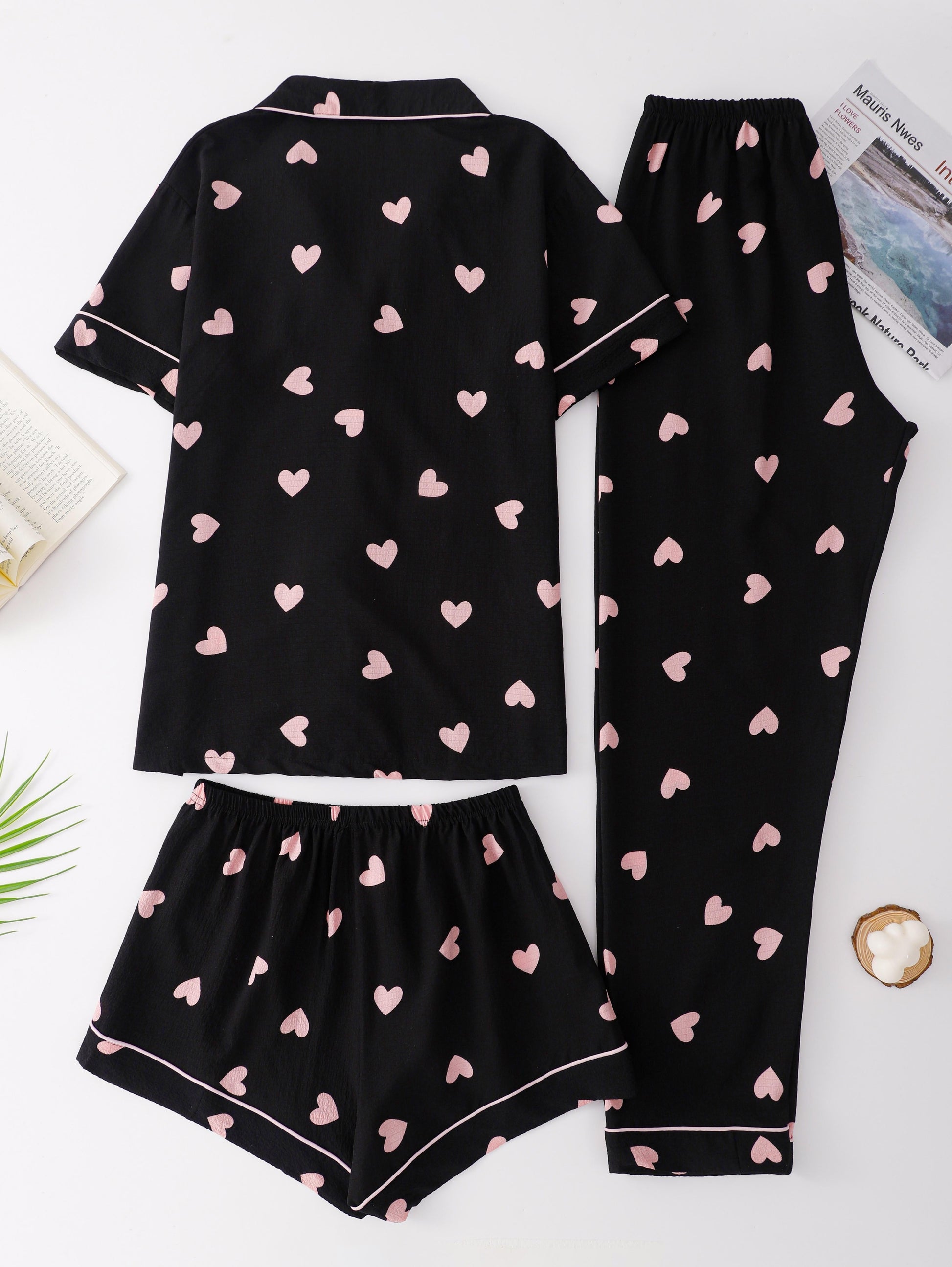 Fall in love with your nights in this black pajama set sprinkled with soft pink hearts. π Made from a lightweight, breathable fabric, itβs designed to keep you cozy while adding a touch of cuteness. The white piping details and classic button-down style make it effortlessly chic, while the matching shorts and pants give you the freedom to lounge your way.