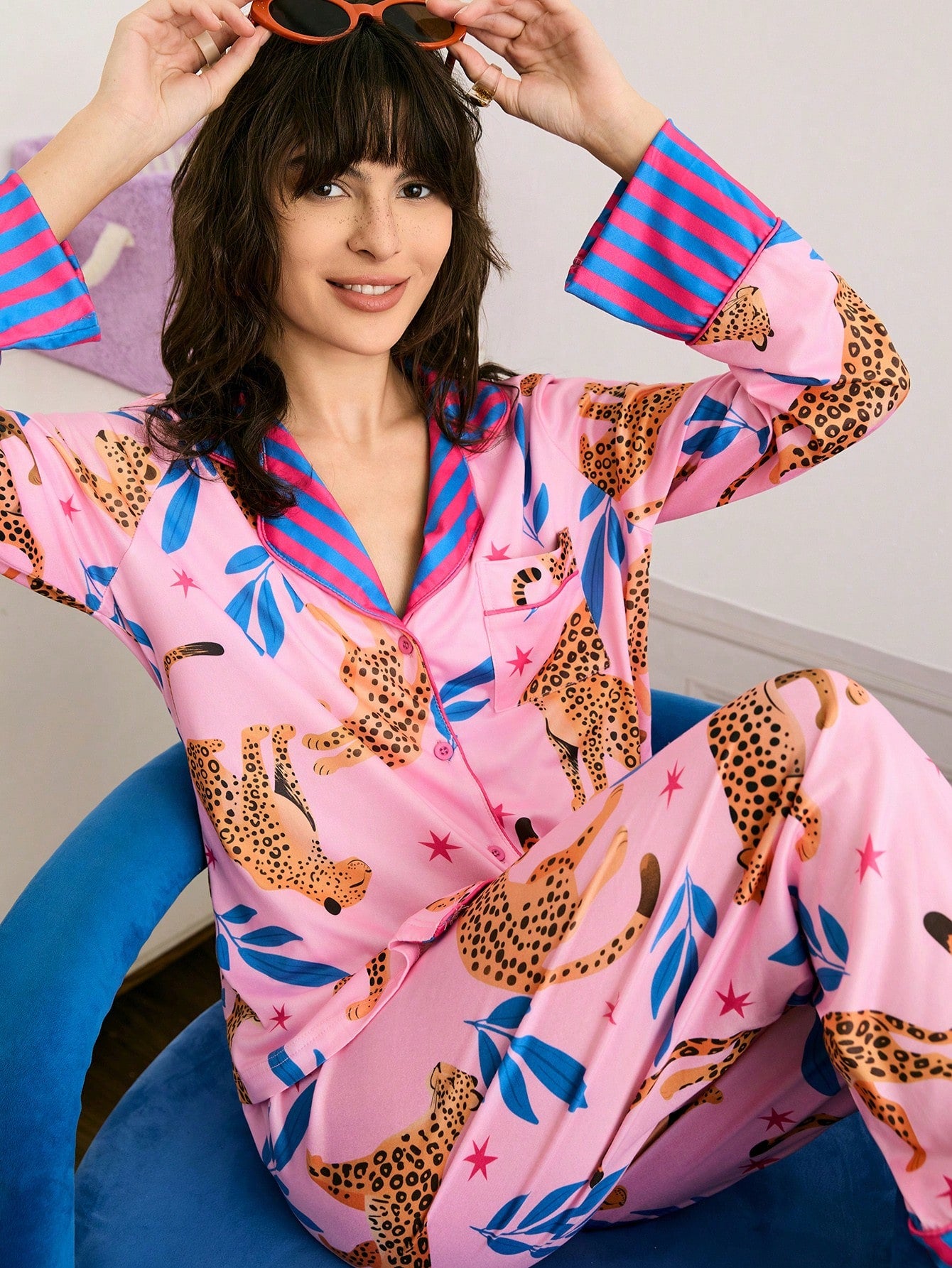 The Pink Leopard Lounge Pajama Set is a bold, fashion-forward sleepwear statement designed for customers who appreciate playful prints and standout color. This two-piece set features a vibrant pink base with an all-over illustrated leopard motif, accented by star details and tropical-inspired elements. The long-sleeve button-front top is styled with a classic collar and finished with contrasting striped cuffs and trim for a polished, boutique-ready look. Matching straight-leg pants offer a relaxed fit with coordinating striped hems for visual balance. Crafted for comfort and style, this set transitions seamlessly from lounging to sleep while delivering a confident, modern aesthetic.